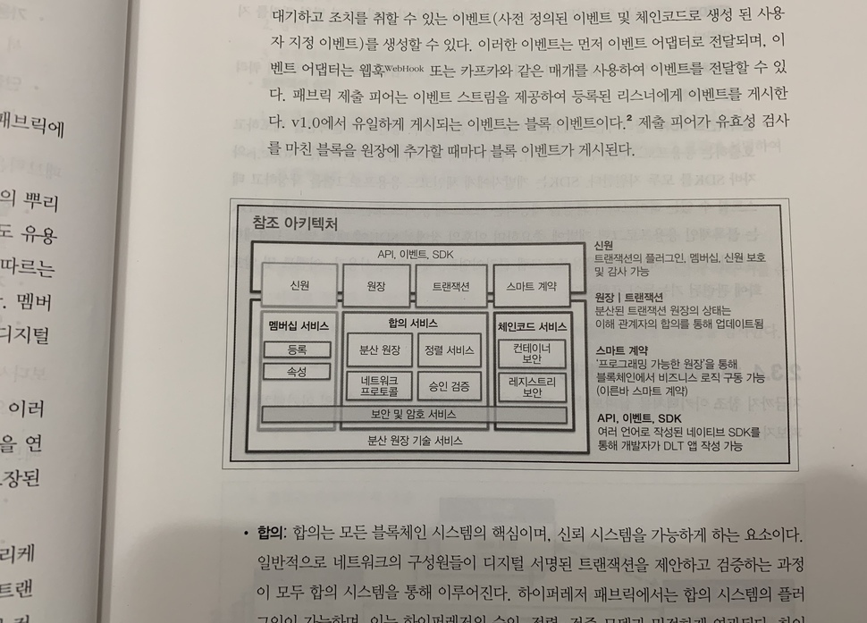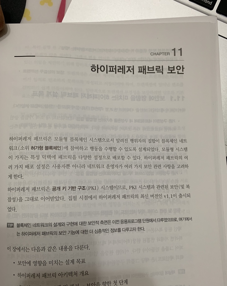 하이퍼레저 패브릭 보안 하이퍼레저 패브릭 아키텍처에 대해서 반복적으로 설명하며 보안적 관점 또한 살펴볼 수 있다. CA, 각 피어, 스마트 계약이나 원장, 정렬 서비스 등에 대해 각각 보안적으로 고려할 사항을 설명한다. 아쉬운 점으로 최근 개인화된 정보를 처리하기 위해 많이 알려진 영지식에 대해서는 소개만 하는 수준이다.