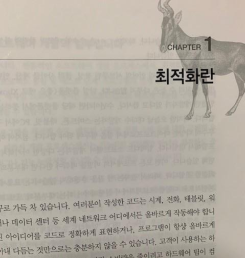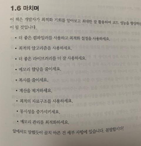 챕터 시작 글 각 챕터는 첫 소개 설명부터 시작하여 최적화 방법에 대한 설명 그리고 중간중간 최적화에 대한 가벼운 사례 및 예제 코드 그리고 마지막 마무리로 구성되어 있다.