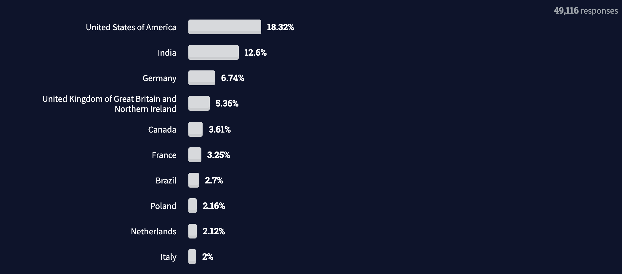 세계적으로 영향력 있는 QnA 서비스이자 커뮤니티인 stacoverflow는 매년 개발자 설문을 진행하여 웹사이트에 공유한다. 아래는 응답자 상위 10개 국가이다. 북미, 인도, 유럽 등이 주요 응답자들이다. 전 세계 대상의 설문조사라고 하지만 전문적인 샘플링 아니기 때문에 내용 자체는 일부 국가에만 맞는 내용일 수 있다. 개발 트렌드에 대한 소소한 인사이트를 얻을 수 있는 자료 또는 참고용으로 보면 좋다.