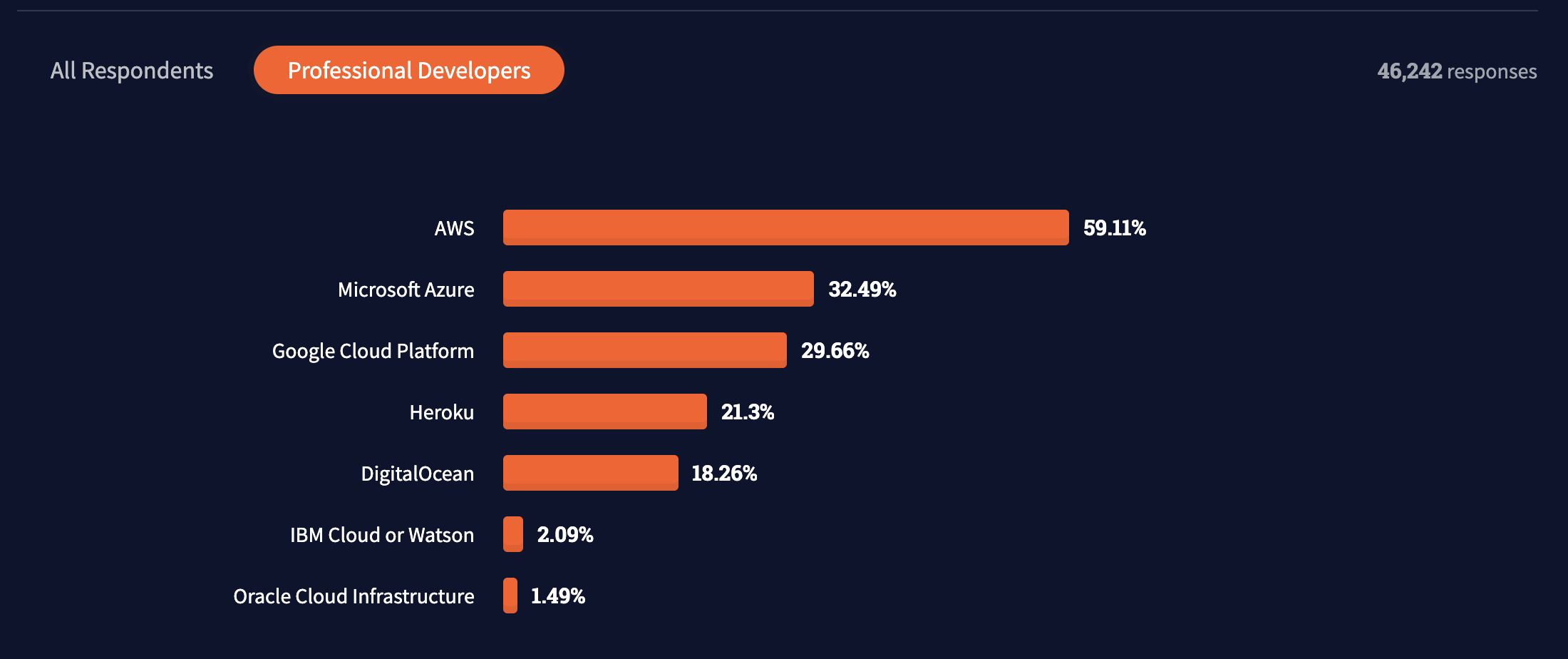 아마도 많은 사람들이 고개를 끄덕일텐데 AWS가 많은 영역에서 활용되고 있다. 주변에는 사례가 거의 없어 와닿지는 않지만 Azure 또한 생각보다 많이 사용된다. 마이크로소프트의 주식이나 매출을 고려하면 어느 정도 이해가 되긴 하다. PaaS로써 꽤 잘 나가는 Heroku 또한 이렇게 보니 반갑다.