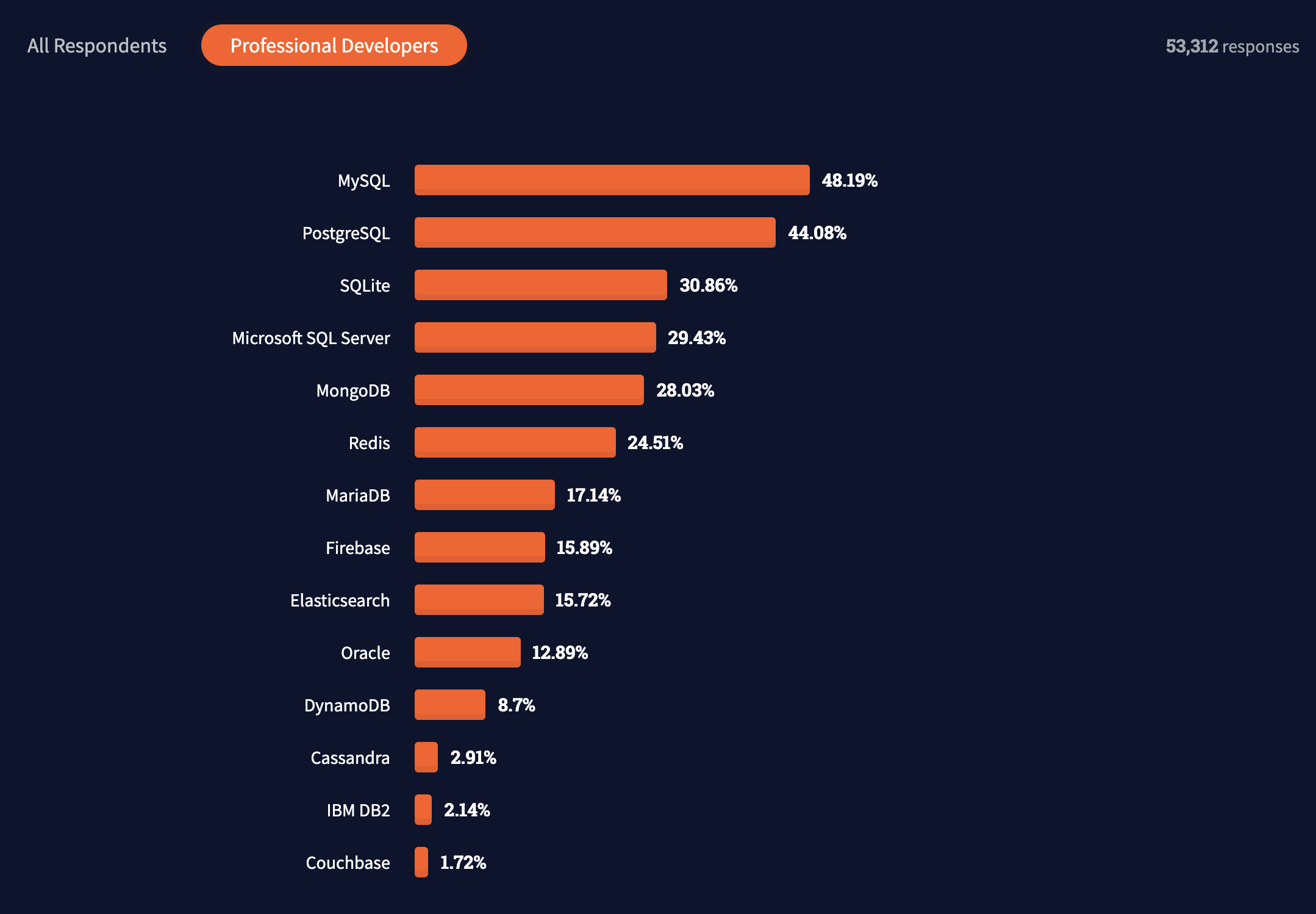 MySQL은 사용 라이센스 비용이 있을 텐데 여전히 사용량에 압도적인 이유는 예전에 사용했었기 때문이 아닐까 싶다. 서비스 개발에 있어 NoSQL에서는 MongoDB, Redis, ElasticSearch를 꽤 많이 사용하는데 수치로도 확인할 수 있었다. Oracle 사용 비중은 점차 줄어들고 오픈소스 DB들의 사용 비율이 늘어나고 있지 않을까.
