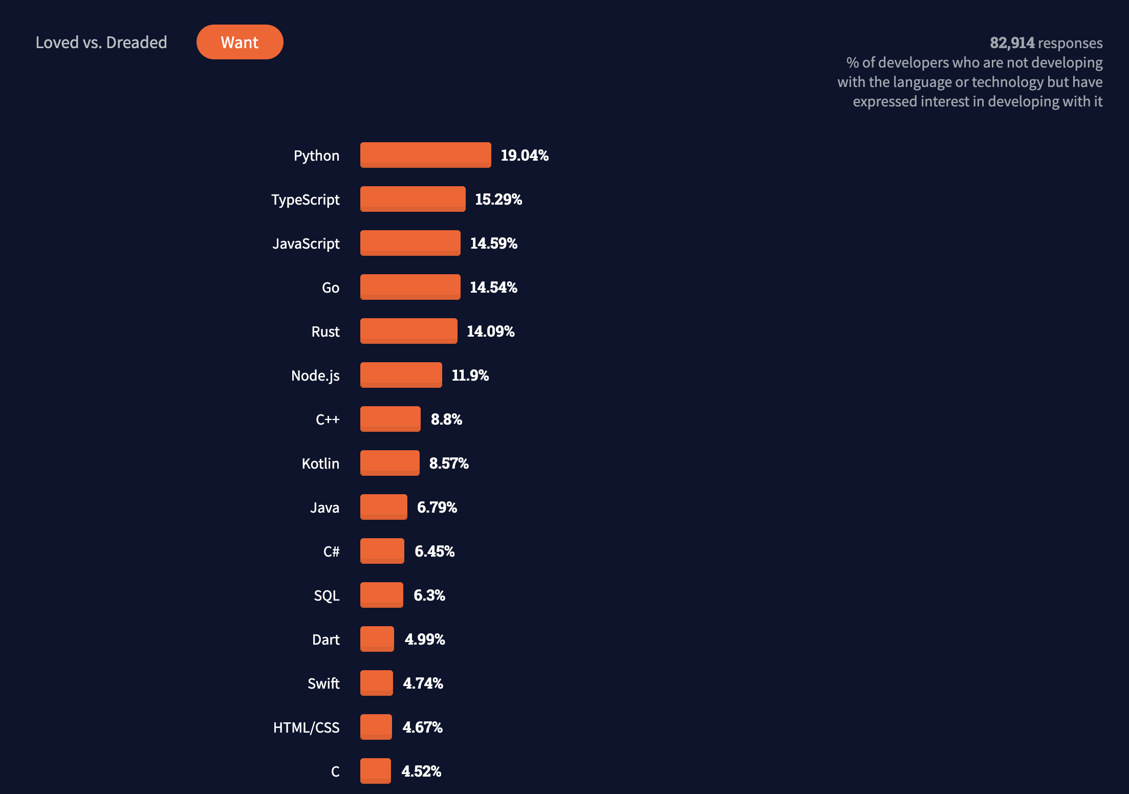 몇년전부터 javascript의 강세이고 올해도 역시 Javascript가 사용자들에게 널리 사용되고 있다. javascript를 사용하는 응답자가 68%이고 그중 마이크로소프트의 typescript를 36% 정도 사용하는 것을 봐서는 javascript를 사용하는 개발자 절반은 typescript를 사용하고 있음을 알 수 있다.
