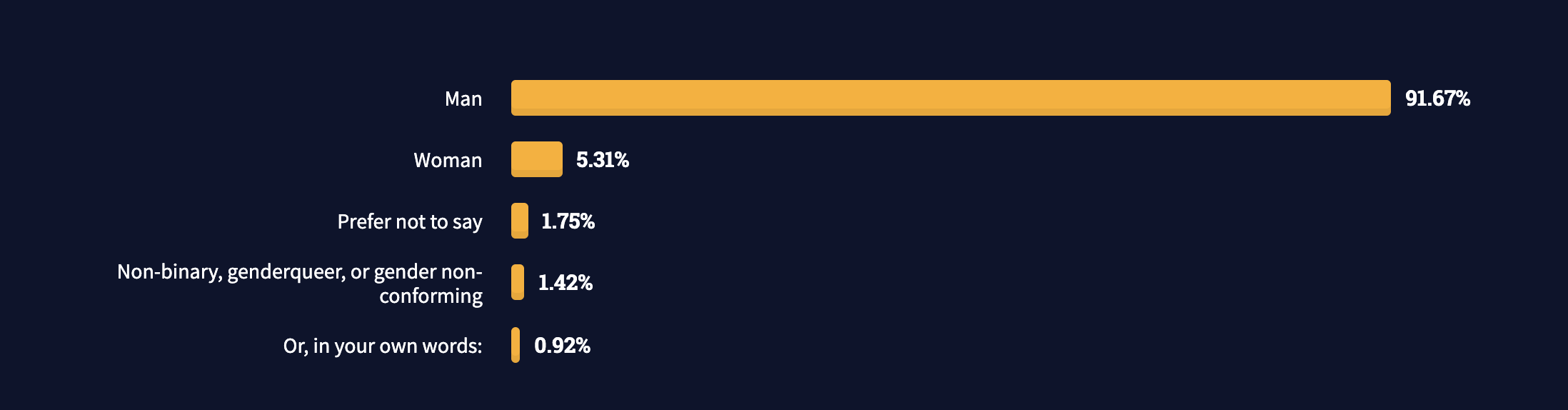 성별을 보자면 여전히 남성의 비율이 압도적이다. 물론 과거 대비 점차 비율이 조정되고 있을텐데, 약 10년 정도 뒤면 성별 비율이 더 나아지지 않을까 싶다.