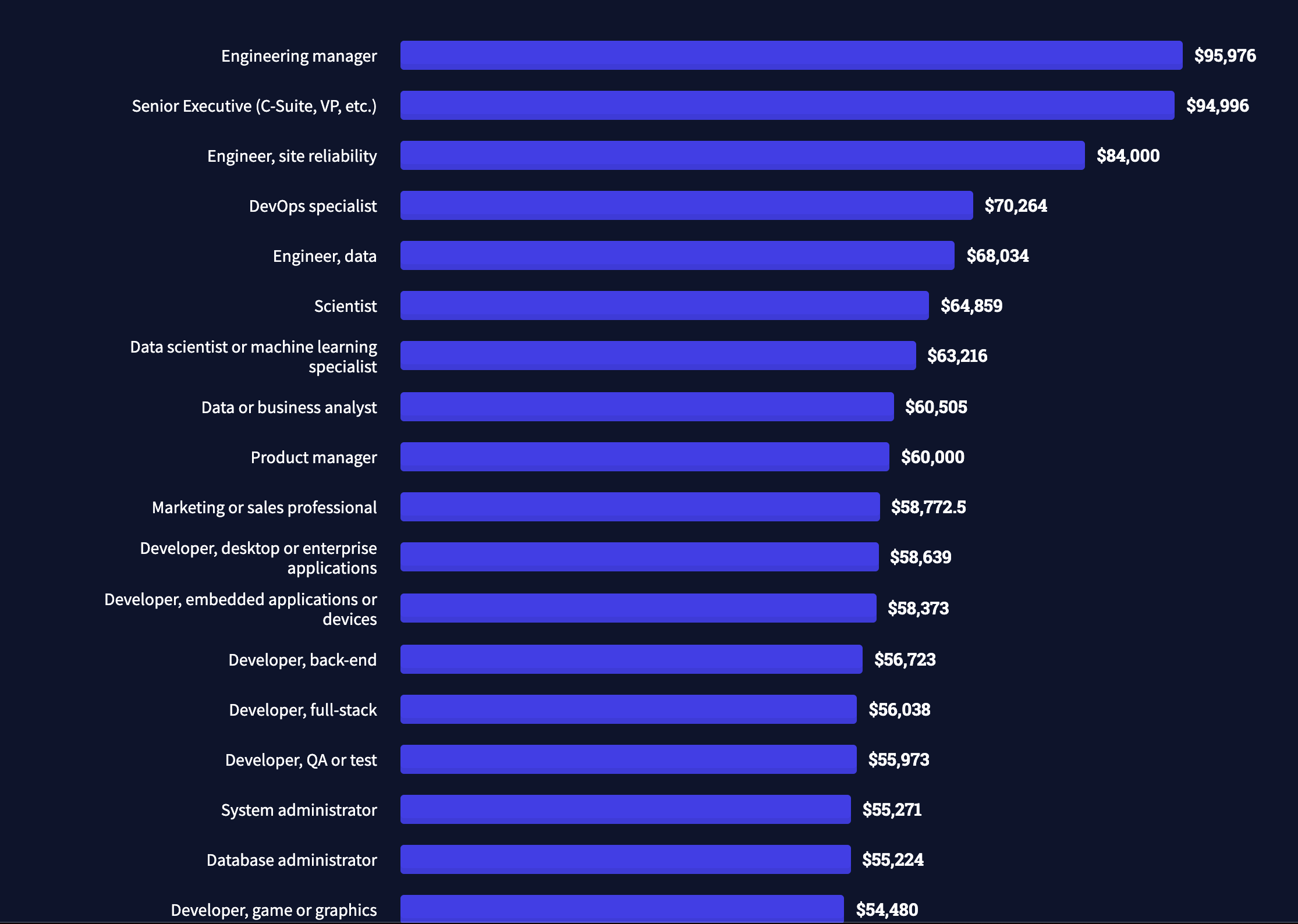 전통적으로 상위 의사결정자 그리고 매니저등이 고연봉을 받았었고 이번 설문조사에도 동일하다. DevOps 또는 Site reliability engineer가 상위권에 있는 것이 특징이다. DevOps 및 Site reliability enginner는 스타트업보단 꽤 성숙한 중견 이상의 기업들에서 일하는 엔지니어들이 아닐까 싶다.