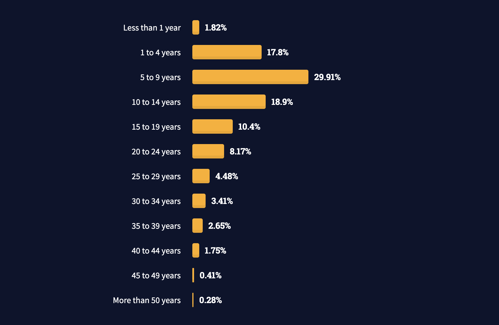 약 10년차를 기점으로 10년 차 미만이 50% 10년 차 이상이 약 50% 비율을 갖는다. 전 세계적으로 10년 차 넘게 일하고 있는 개발자들이 생각보다 많음을 알 수 있다. 개인적인 경험으로 우리나라에서도 10년 이상 경력자들이 과거 대비 꽤 늘어나고 있어 긍정적인 하나의 지표가 아닐까 생각된다.