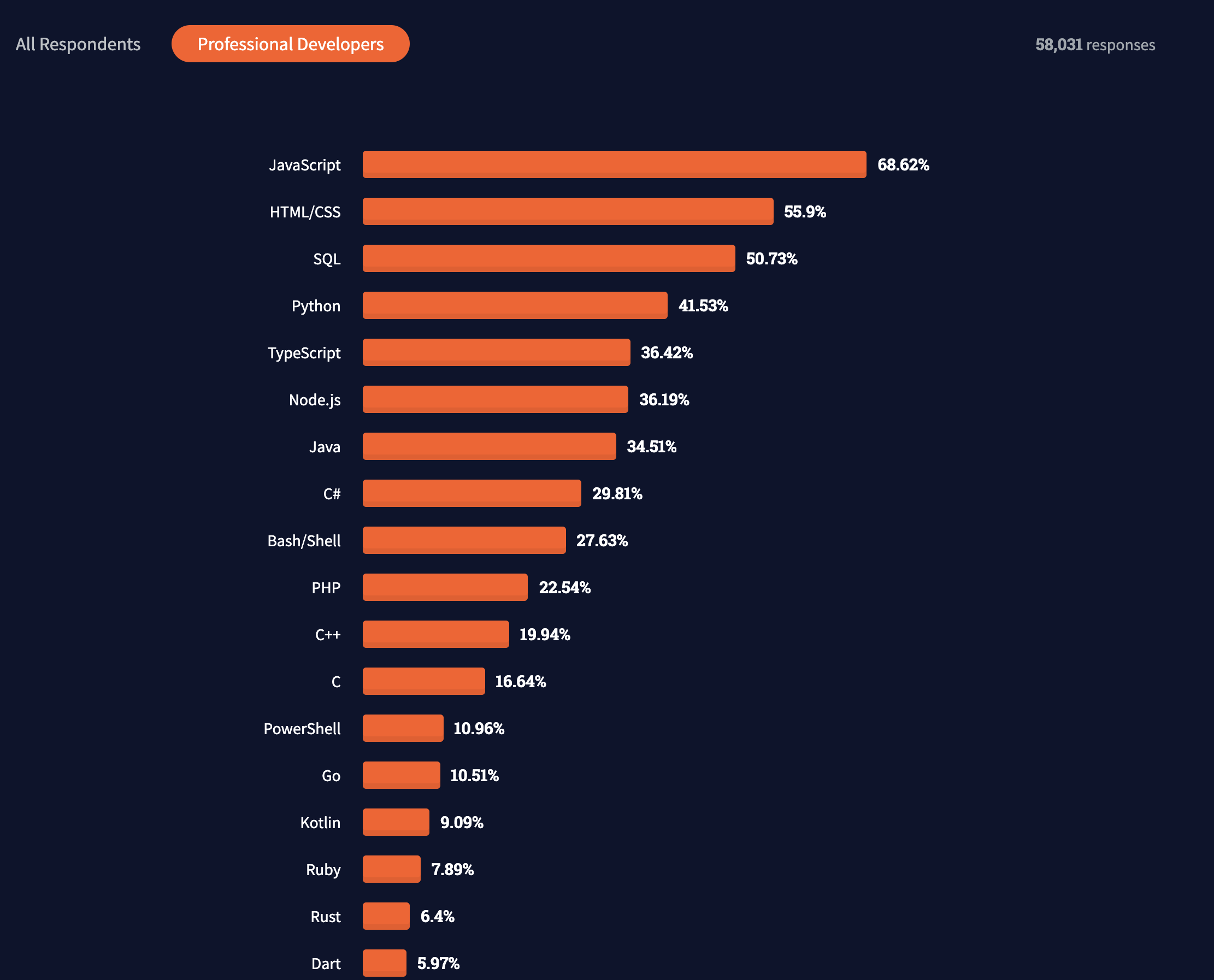 몇년전부터 javascript의 강세이고 올해도 역시 Javascript가 사용자들에게 널리 사용되고 있다. javascript를 사용하는 응답자가 68%이고 그중 마이크로소프트의 typescript를 36% 정도 사용하는 것을 봐서는 javascript를 사용하는 개발자 절반은 typescript를 사용하고 있음을 알 수 있다.