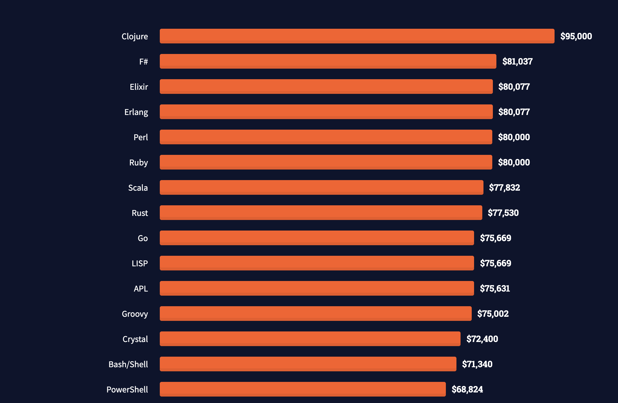 예전부터 강력했던 Java, C/C++, PHP, C#등은 여전히 10위권 이내에 자리 잡고 있고 그 뒤를 이어 Go, Kotlin, Rust, Dart 등 트렌디한 언어들이 그 뒤를 이었다.