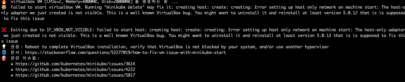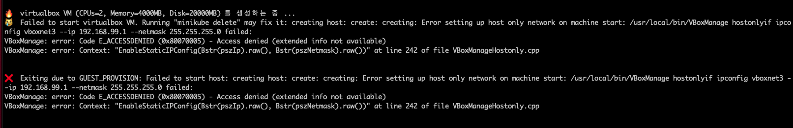2번째 시련 😿 Failed to start virtualbox VM. Running "minikube delete" may fix it: creating host: create: creating: Error setting up host only network on machine start: /usr/local/bin/VBoxManage hostonlyif ipconfig vboxnet3 --ip 192.168.99.1 --netmask 255.255.255.0 failed: