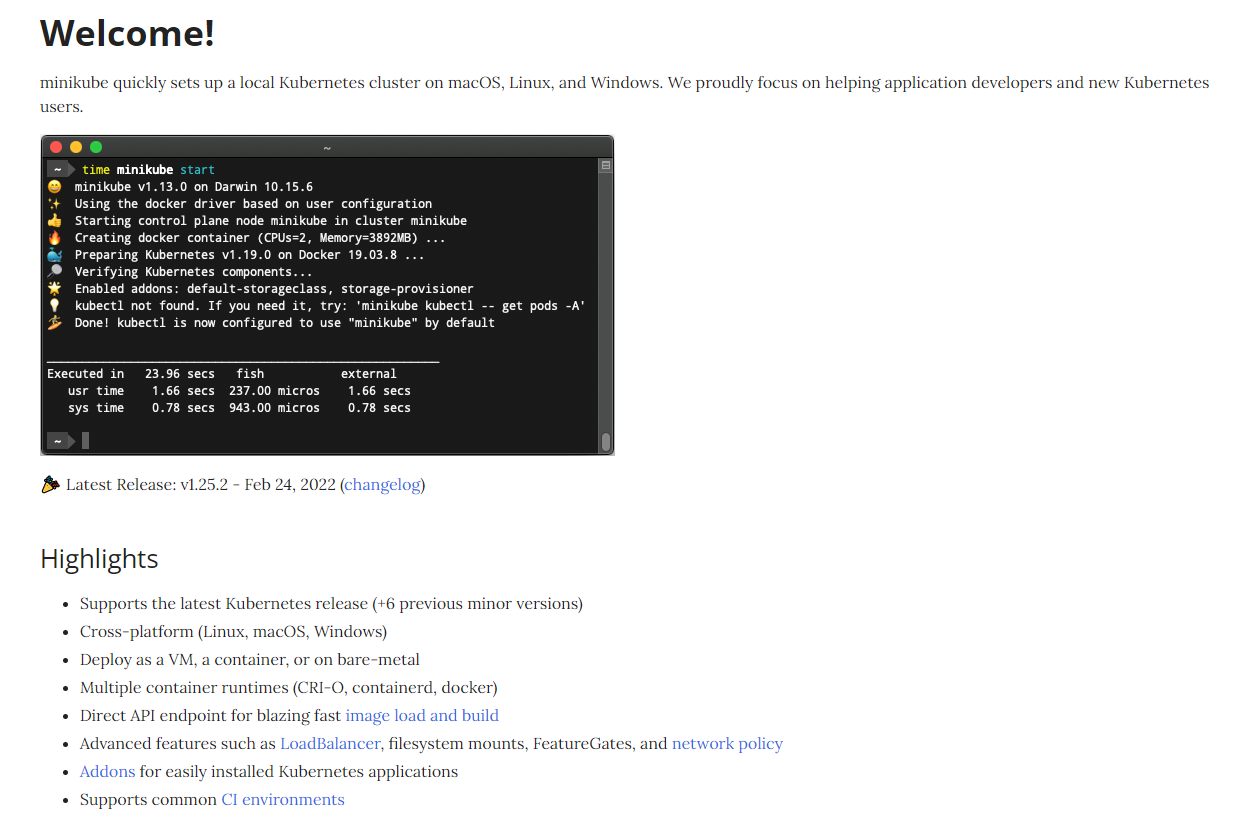 이모티콘도 귀여운 minikube 여기서부터 이야기할 minikube는 로컬 개발환경에 설치하여 활용할수 있게 만들어진 Kubernetes의 미니 버전이다. 설치 과정은 Docker desktop보다는 몇몇 단계가 더 있을 수 있지만 그리 어렵지는 않다. 아래의 절차를 따라하면 뚝딱뚝딱 준비가 완료될 것이다. 이상하게도 필자가 설치할 때는 몇몇 시련이 있었는데 관련 내용도 함께 작성하였으니 참고가 되었으면 한다.
