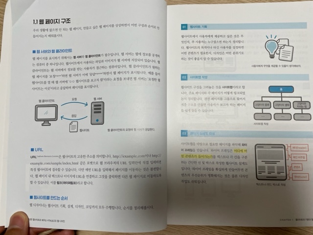첫 장은 "웹사이트의 기본과 필수 도구"가 제목으로, top-down 방식으로 간략하게 웹 기술에 대해서 설명하고 HTML 기초에 대해서 설명해준다. 사실 첫 프론트엔드 개발을 진행할 때 와이어프레임이 무엇인지 목업디자인은 어디까지를 말하는지를 몰라서 헤맸던 경험이 있다. 간결하지만 이러한 설명들은 초보 개발자들에게 도움이 된다.