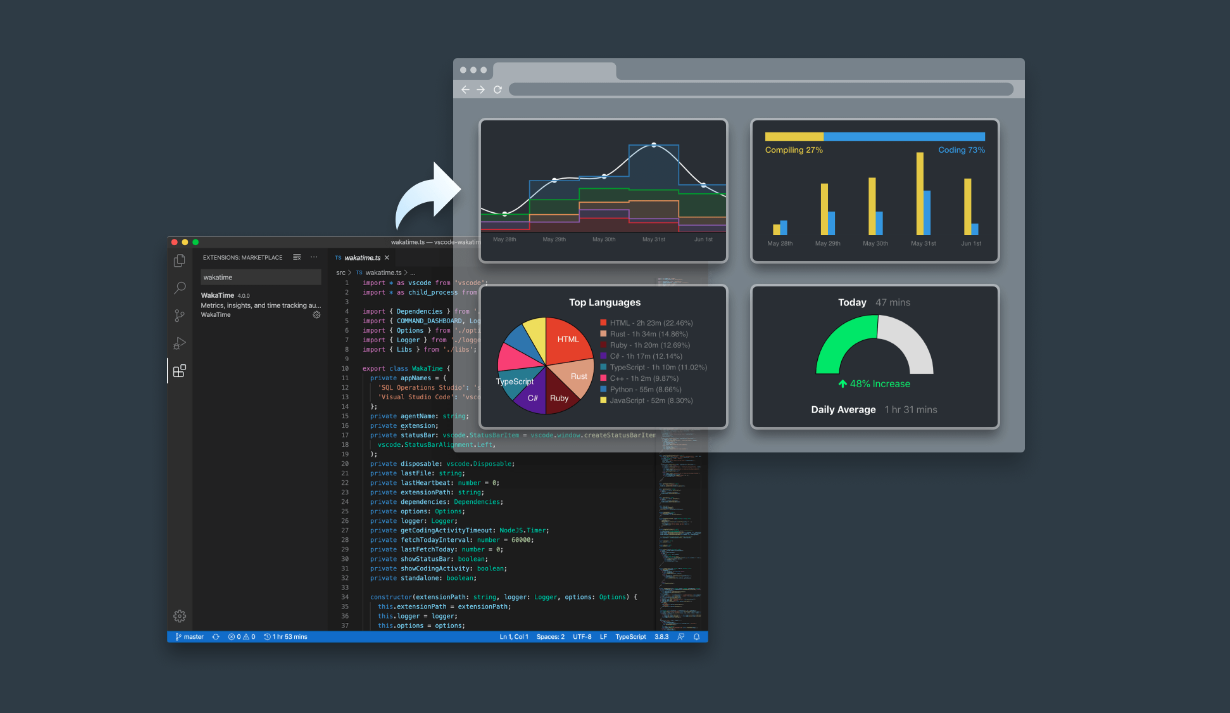 출처: WakaTime 홈페이지 이러한 질문에 명쾌하게 답을 줄 수 있는 제품이 있다. 바로 WakaTime이다. 작년에 가입을 하고 대략 일년 넘게 활용 중이다. 내가 업무와 관련된 개발 시간을 얼마나 들이고 있는지 그리고 오픈소스나 사이드프로젝트는 얼마나 시간을 쏟는지를 알고 싶었다. 가장 좋은 점은 일주일 단위로 통계정보를 요약해서 이메일로 보내준다는 점이다. 그래서 이메일만 잘 살펴보면 실제로 쓰고 있는 개발 시간에 대한 추적이 충분히 가능하다. 무료 플랜은 데이터 조회기간에 제한이 있는데 나의 경우에는 크게 문제가 되지 않았다. 참고로 연동 과정은 매우 간단하다. 사용하고 있는 IDE의 plugin으로 wakatime을 찾아서 설치하면 된다.