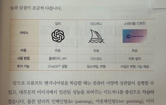 대표 생성형 서비스 Dall-E, Midjourney, Stable Diffussion 목차 중 PART02 이미지 생성 AI 실무 활용하기에서 "일상에서 이미지 생성 AI 활용하기", "회사 업무에 이미지 생성 AI 활용하기", "디자인 실무에 이미지 생성 AI로 어이디어 얻기"를 주제로 각각 3~4개의 이미지 생성 예시들을 확인할 수 있다.