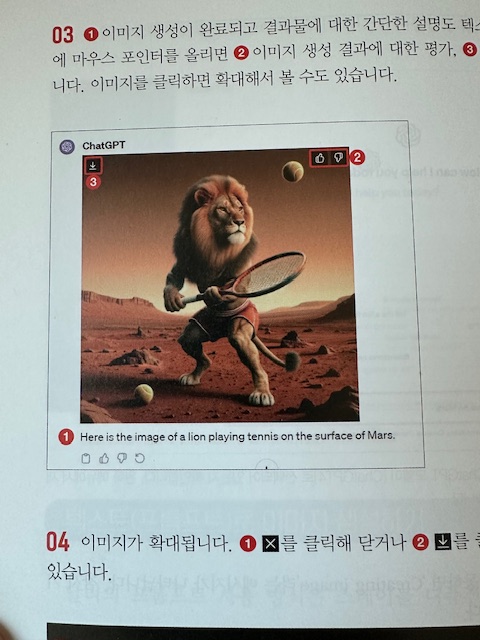 책 초반부분에 텍스트를 기반으로 이미지가 어떻게 제공되는지 간략하게 소개가 나온다. 위 사진은 화성에서 테니스를 치고 있는 사자를 만들어달라고 한 결과물이다.