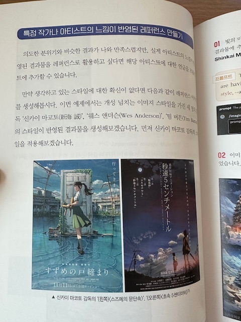 페르소나 인물 예시 책을 읽어나가면 굉장히 쉽다!라고 느낄 수 있고 읽는데 1~2시간이면 충분하다. 쉽게 느끼는 이유는 저자가 알고 있는 그리고 경험한 지식들이 잘 녹여져 있기 때문이라고 생각한다. 막상 만들고 싶은 이미지에 대한 프롬프트를 작성해보려고 하면 생각보다 어떤 키워드를 프롬프트에 포함시켜야 할지 생각이 잘 안난다. 그럴 때 마다 책에 작성된 내용을 다시 확인하여 프롬프트를 작성하는등 꾸준히 연습하는게 필요해 보였다.