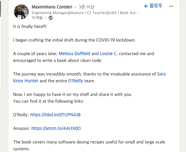 지은이 막시밀리아노 콘티에리는 약 25년동안 소프트웨어 업계에 종사하였는데 그 중 14년째는 대학 강의를 하고 있는 사람이다. 이름이 익숙하지 않은 발음이라 어느 국가 사람일까 궁금했는데 아르헨티나 국적을 가진 사람이었고 링크드인 프로필을 보면 책과 관련된 언급을 찾아볼 수 있다. 대략 1년이 안된 책이 한국어로 번역까지 되어 출판된 것을 보면 얼마나 따끈따끈한 책인지를 알 수 있다.