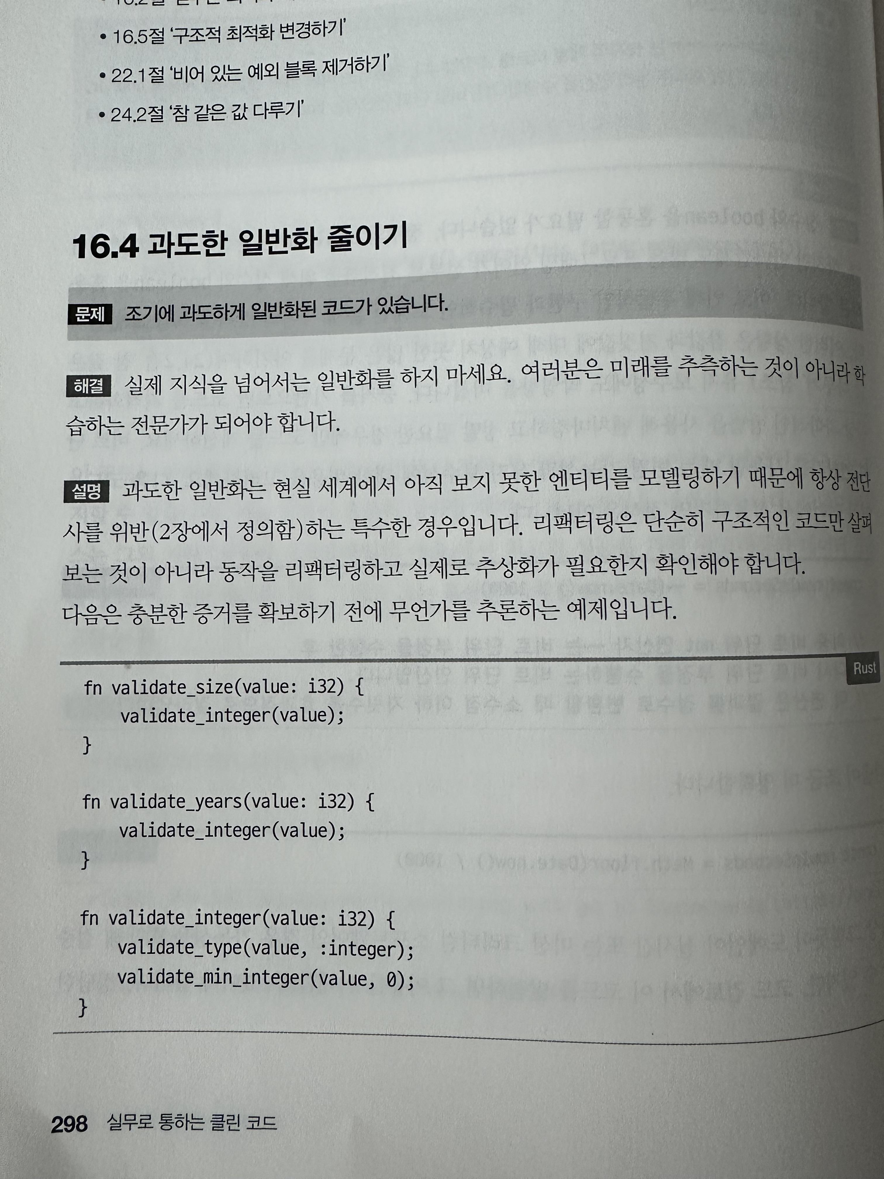 Chapter 1,2에서 클린코드에 대한 설명 그리고 공리(수학에서 가장 근본이 되는 기초 명제)를 시작으로, Chapter 3부터 다양한 예시들을 설명해 나가는데 "문제", "해결", "설명" 순으로 진행이 된다. 문자열 남용 제거하기처럼 선언적으로 변환하는 간단한 예시들부터 시작하여 디자인 패턴에 대한 인용 그리고 놓치기 쉬운 과도한 일반화에 대한 내용을 첨부한다.