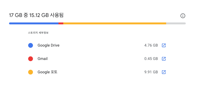 전체 가용 스토리지 용량 대비 세부 정보를 살펴보니 Google 포토가 압도적인걸 보면 사진이나 동영상이 많이 저장되고 있는 상태이다. 여담으로 기본 15G 용량을 무료로 제공하는데 2016년 보안 점검 보너스로 2G를 더 받아서 총 17G이다.
